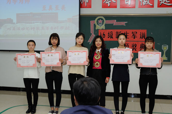 颁奖典礼在2016级新生赵学文同学的主持下顺利开展。首先观看一个感人的军训短片,回顾同学们为期五天的军训生活,让同学们再次看到时充满着激情和感动。此次颁奖典礼共设 “内务评比先进集体”、“军训会操一、二、三等奖”、“优秀组织奖”、“优秀服装奖”、“吃苦耐劳奖”五个集体奖项,共计40个班级获奖;另外还有“军训先进个人”和“内务评比先进个人”两个单项奖。学生处处长周杰、学生处副处长孙晓达、学生处老师孙静峰分别为获奖同学颁奖并合影留念,一张张笑脸定格在镜头中,这是他们共同努力的成果。1613班杨惠冰同学作为获奖学生代表上台发言,她一方面感谢了老师和教官的辛勤付出、肯定了大家的努力,另一方面也坚定了未来继续奋进的决心,为在场的各位同学起到了良好的鼓舞作用。此次颁奖典礼历时一个小时,在同学们的掌声中圆满结束。