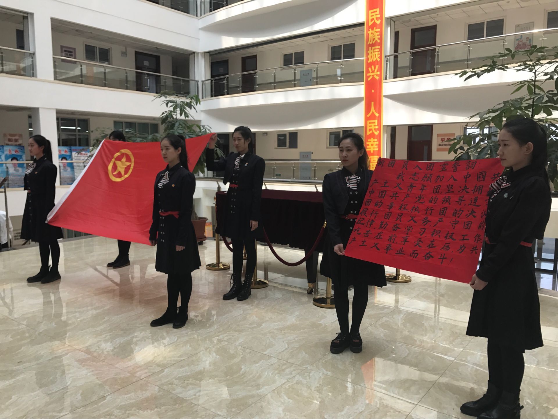 入团仪式上,出团旗,奏团歌,老团员为15名新团员佩戴了团徽,颁发了团证。新团员们胸前佩戴着崭新的团徽,她们怀着兴奋、激动的心情,庄严地举起右拳,整齐而洪亮地进行了入团宣誓。共同表达了青年学生爱团、爱党、爱社会主义事业的信念与决心。