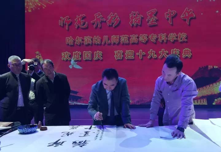 在庆典现场,翟鑫先生当场挥毫,为迎接党的十九大和共和国六十八岁华诞题字,和师生共同欢庆。翟鑫院长现场挥洒自如的创作、精湛的书法技艺和美轮美奂的书法作品,充分展示出书法艺术的独特魅力以及祖国传统文化的博大精深,在场的所有人都被深深地感染。