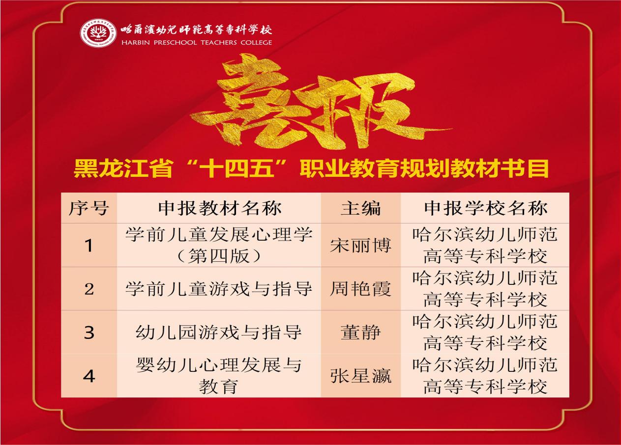 近日,黑龙江省教育厅发布《关于拟认定(复核)黑龙江省“十四五”职业教育规划教材名单的公示》,我校宋丽博老师《学前儿童发展心理学(第四版)》、周艳霞老师《学前儿童游戏与指导》、董静老师《幼儿园游戏与指导》与张星瀛老师《婴幼儿心理发展与教育》共4部教材成功入选黑龙江省“十四五”职业教育规划教材书目,周艳霞老师《幼儿游戏与指导(第二版)》、许大梅老师《美术与幼儿美术创作(第二版)》、刘丽颖老师《简笔画创意教程》有3部教材通过复核,入选首批“十四五”职业教育国家规划教材书目。