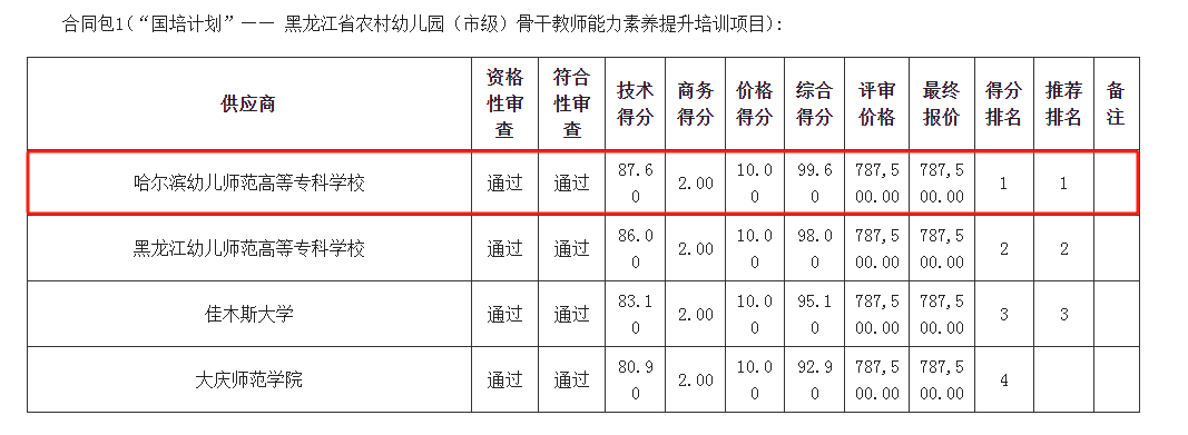 近日,我校在2025年“国培计划”—— 黑龙江省农村幼儿园(市级)骨干教师能力素养提升培训项目招标中,凭借强劲实力,顺利通过资格性与符合性审查,以综合得分99.60的优异成绩,在多家竞争单位中脱颖而出,成功获批该项目承办权,推荐排名与得分排名均位列第一,这是我校连续第三年获得该项目的承办权。